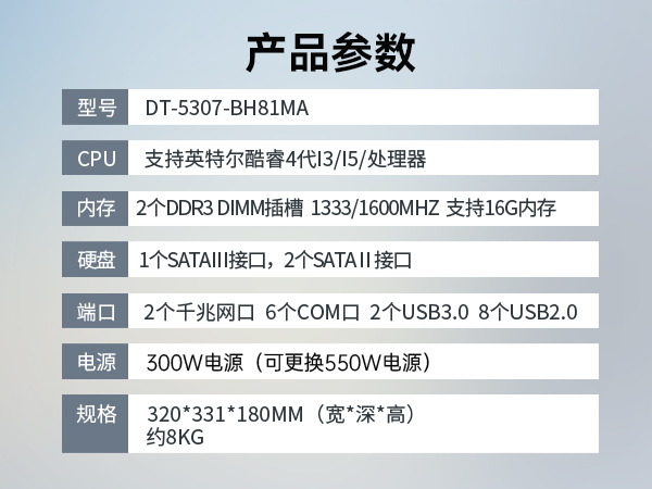東田工控DT-5307-BH81MA是一款壁掛式工控機,采用酷睿4代13/15/17處理器,內(nèi)存2個DDR3,支持16G。300W額定電源。單面出線,支持7個擴展槽,2個千兆網(wǎng)口,6個COM口,支持多種操作系統(tǒng),歡迎定制。